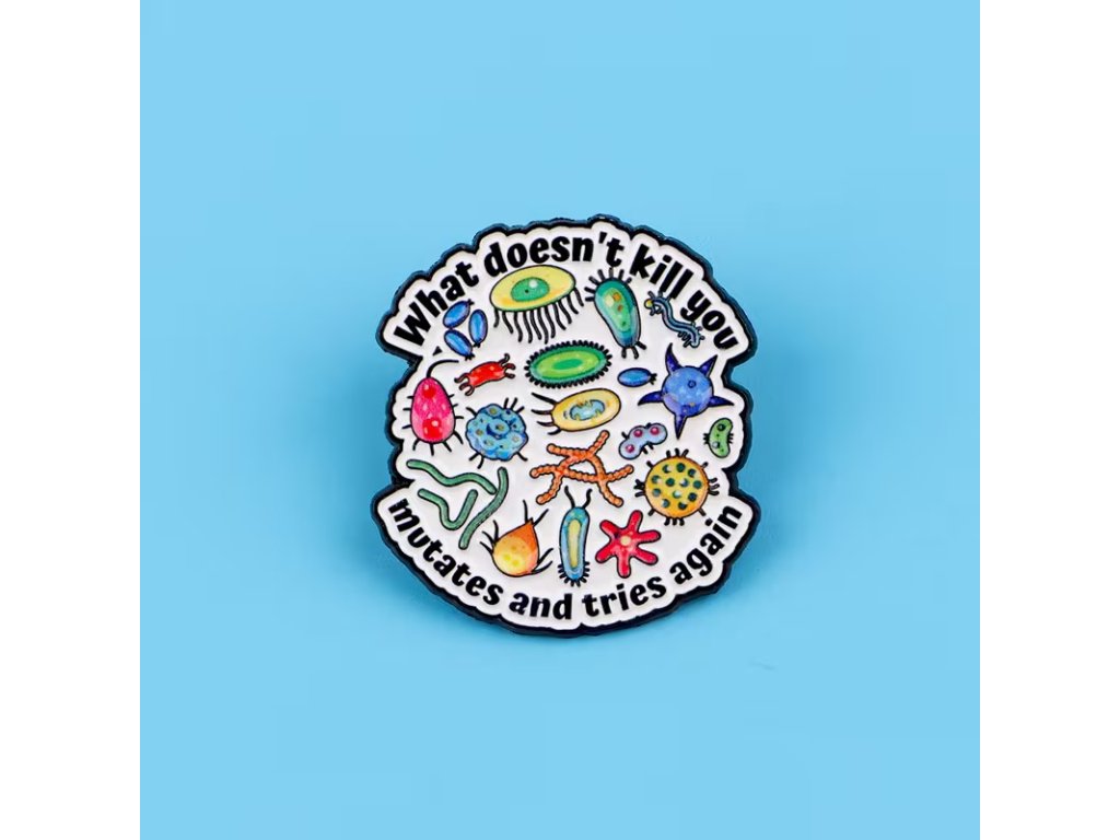 Smaltovaný odznak s motivem barevných mikroorganismů a trefným nápisem „What doesn’t kill you mutates and tries again“ potěší biology nerdy, mediky i každého, kdo má rád chytrý humor.