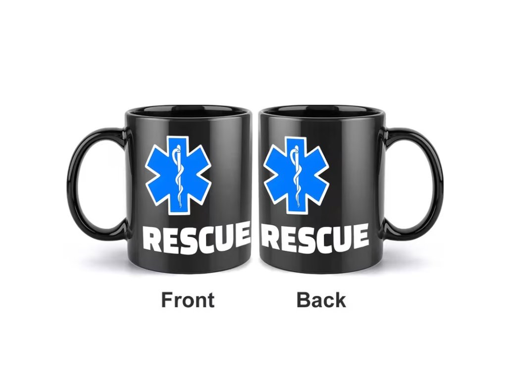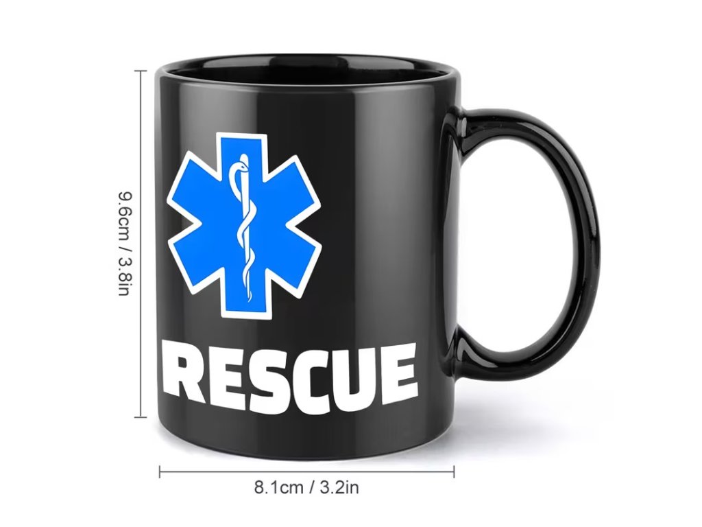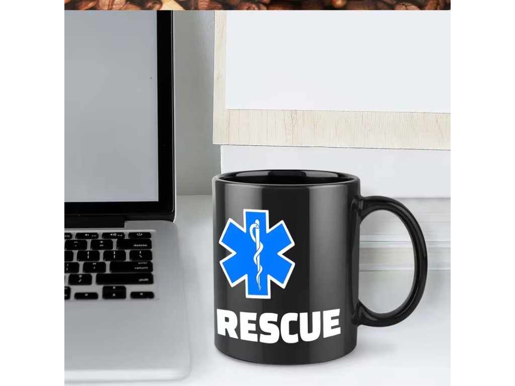 Stylový černý hrnek pro každodenní kávu/čaj s výrazným motivem Star of Life v modré a bílým nápisem RESCUE na přední i zadní straně – potisk je dobře čitelný i na dálku. Kvalitní keramika s hladkou glazurou se příjemně drží a snadno se udržuje. Vhodné do služební kuchyňky, kanceláře i domů.