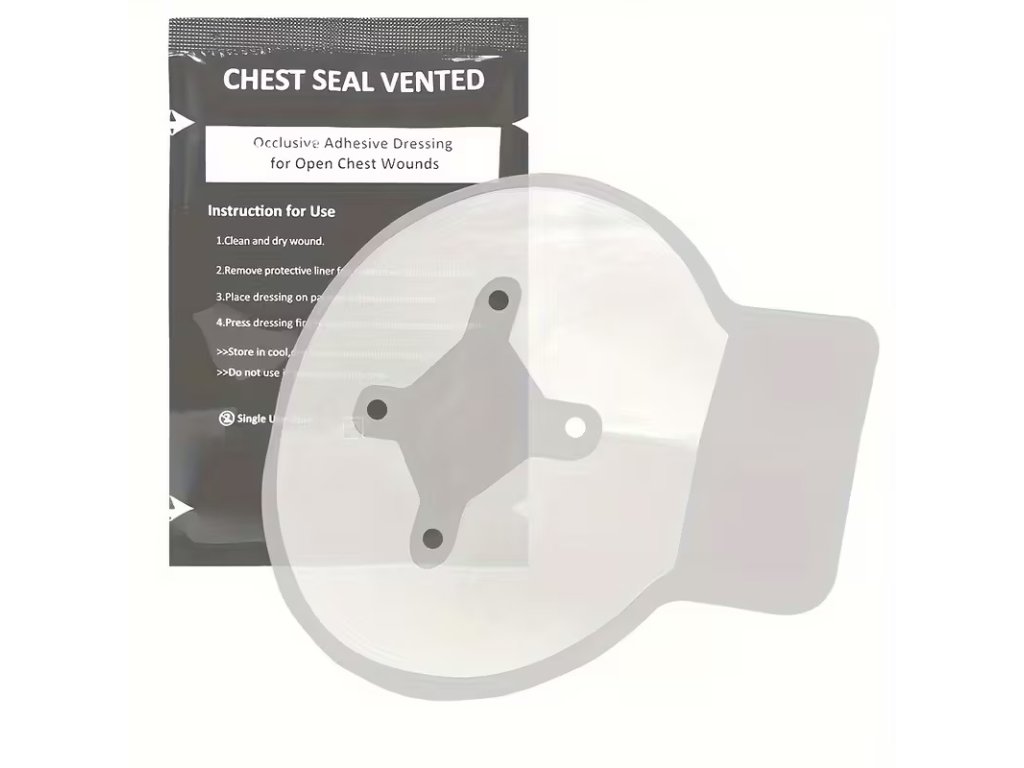 Vented Chest Seal (česky ventilovaná hrudní chlopeň) je occlusivní kryt pro penetrující poranění hrudníku. Jednocestný ventil umožňuje únik vzduchu a tekutin z pleurální dutiny a snižuje riziko tenzního pneumotoraxu tím, že zabraňuje zpětnému nasávání. Lepivá plocha drží i na zpocené/vlhké kůži; quick-tear krycí fólie urychluje aplikaci v rukavicích. Čtvercový tvar usnadňuje spolehlivé utěsnění okrajů v terénu i při výcviku TCCC/TECC.