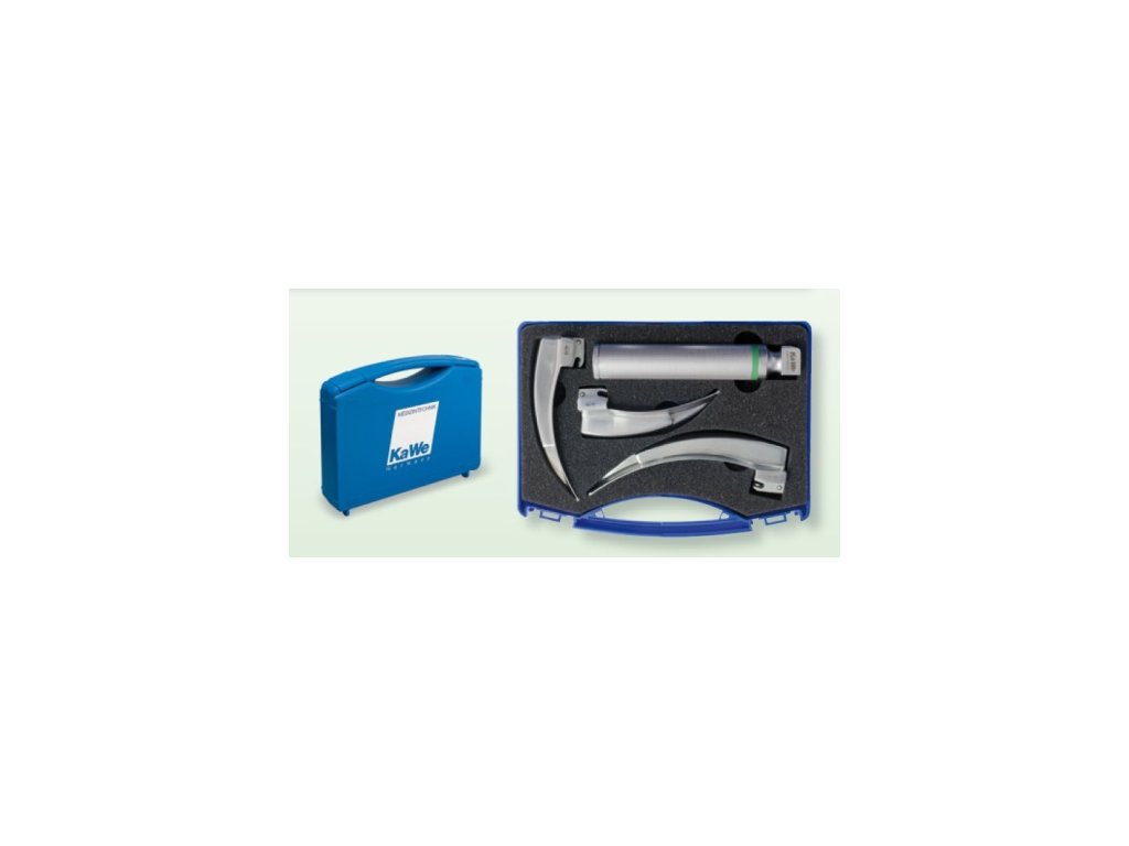 Značkový laryngoskop KaWe. Všechny laryngoskopické lžíce jsou osazeny optickým vláknem MEGALIGHT s vysokou svítivostí.Napájení laryngoskopu 2 x 1,5 AA nebo dobíjecí akumulátor.