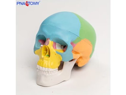 Tento detailní anatomický model lebky zobrazuje realistické struktury lidské hlavy ve 15 oddělitelných částech. Barevné rozlišení pomáhá pochopit vztahy mezi jednotlivými kostmi a usnadňuje výuku anatomie.