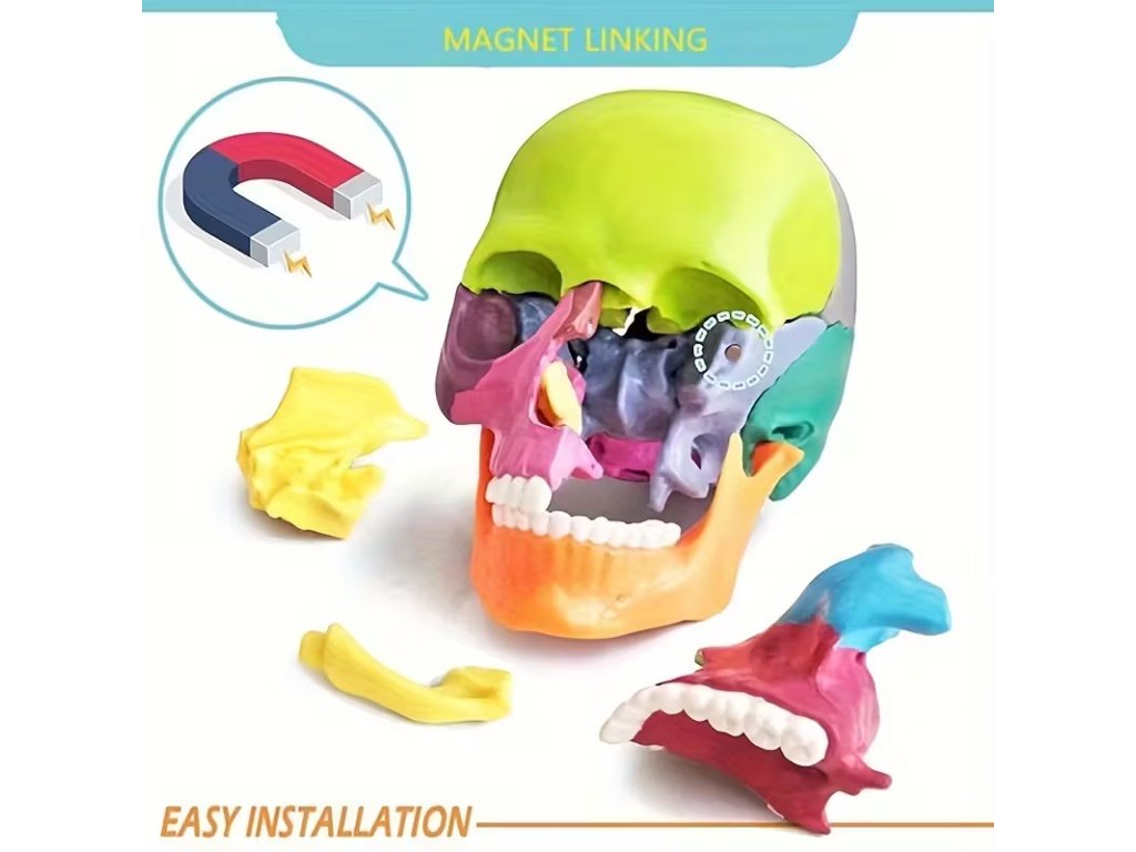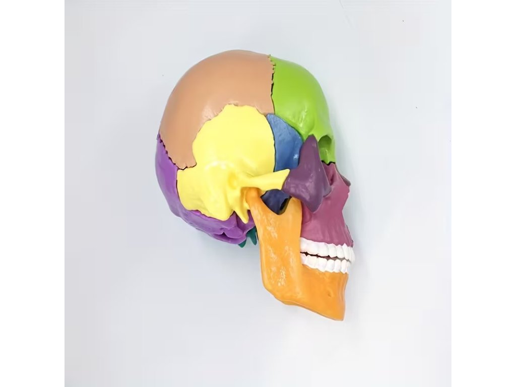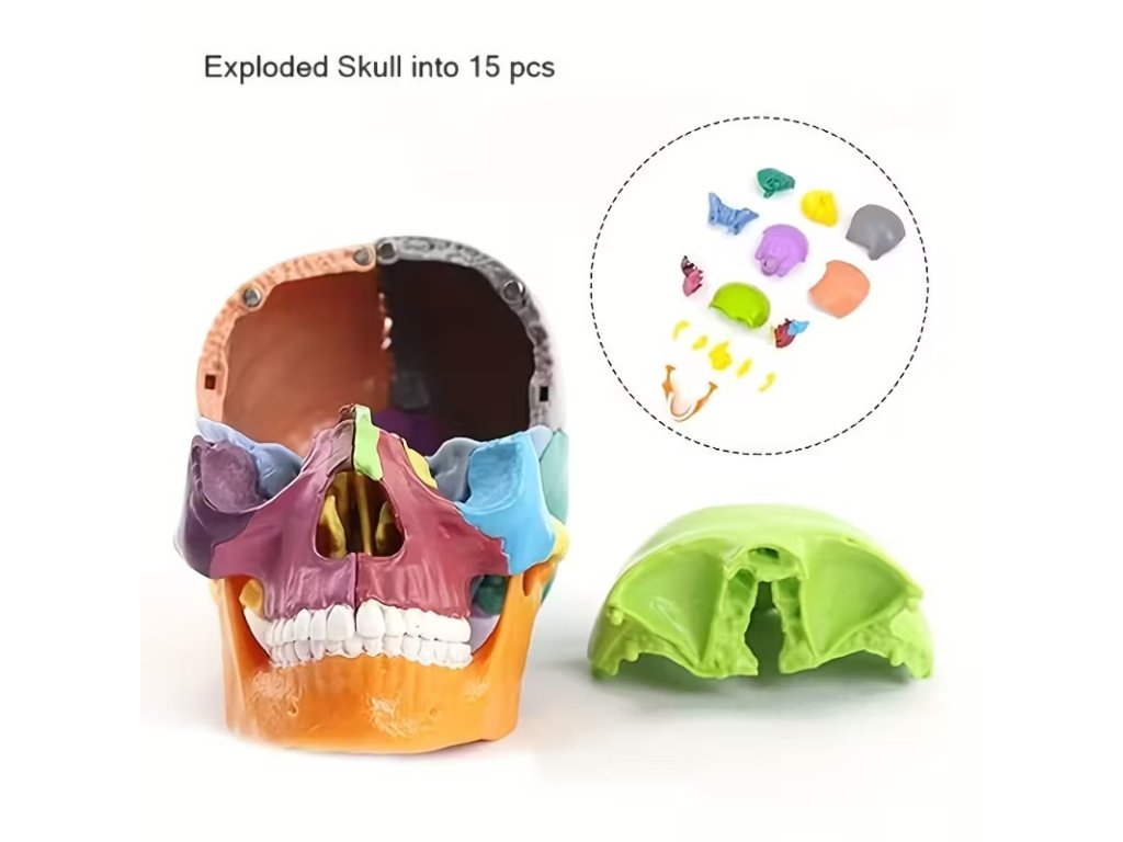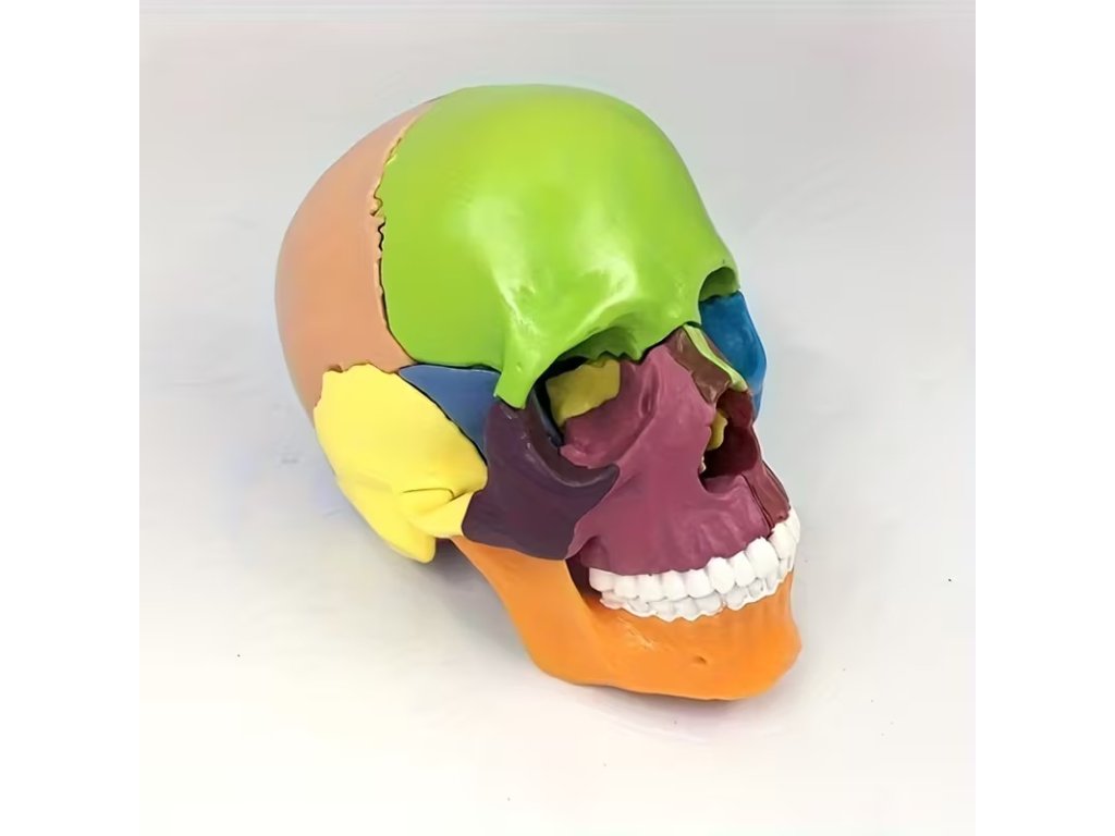Tento detailní anatomický model lebky zobrazuje realistické struktury lidské hlavy ve 15 oddělitelných částech. Barevné rozlišení pomáhá pochopit vztahy mezi jednotlivými kostmi a usnadňuje výuku anatomie.