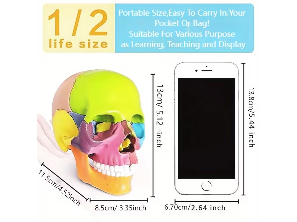 Kompaktní 3dílný barevný model lidské lebky pro výuku anatomie a dentální praxi. Odnímatelné části, realistické...
