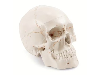 Vysoce kvalitní anatomický model lebky v životní velikosti s vyznačenými švy a číslováním jednotlivých kostí....