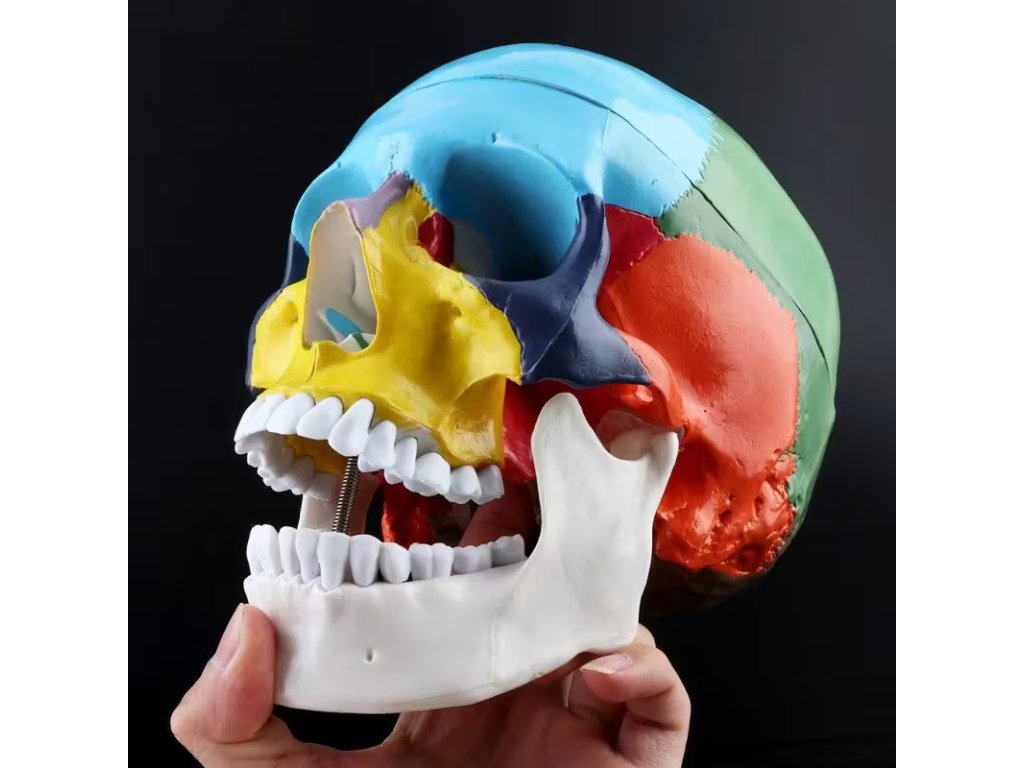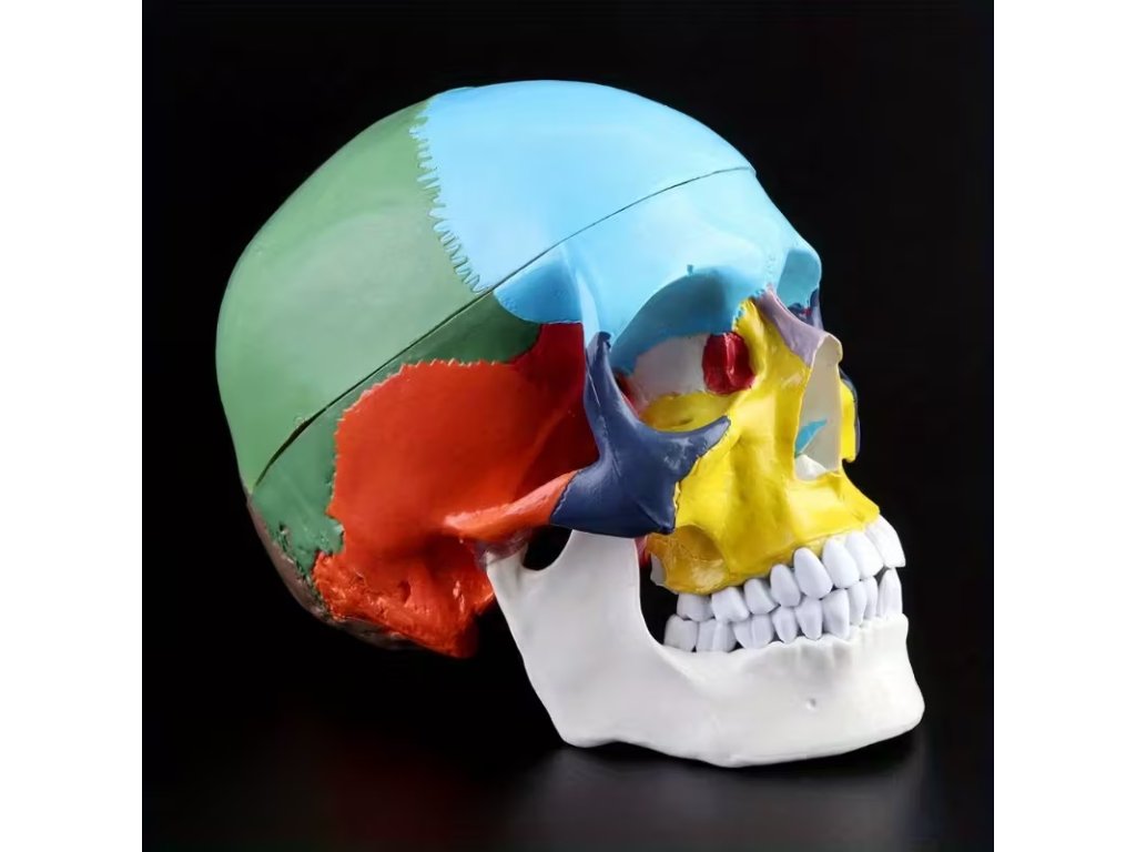 Kompaktní 3dílný barevný model lidské lebky pro výuku anatomie a dentální praxi. Odnímatelné části, realistické...