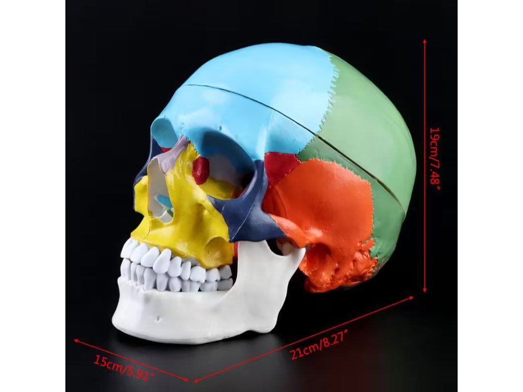 Detailní 15dílný anatomický model lidské lebky v barevném provedení. Odnímatelné části, ideální pro výuku,...
