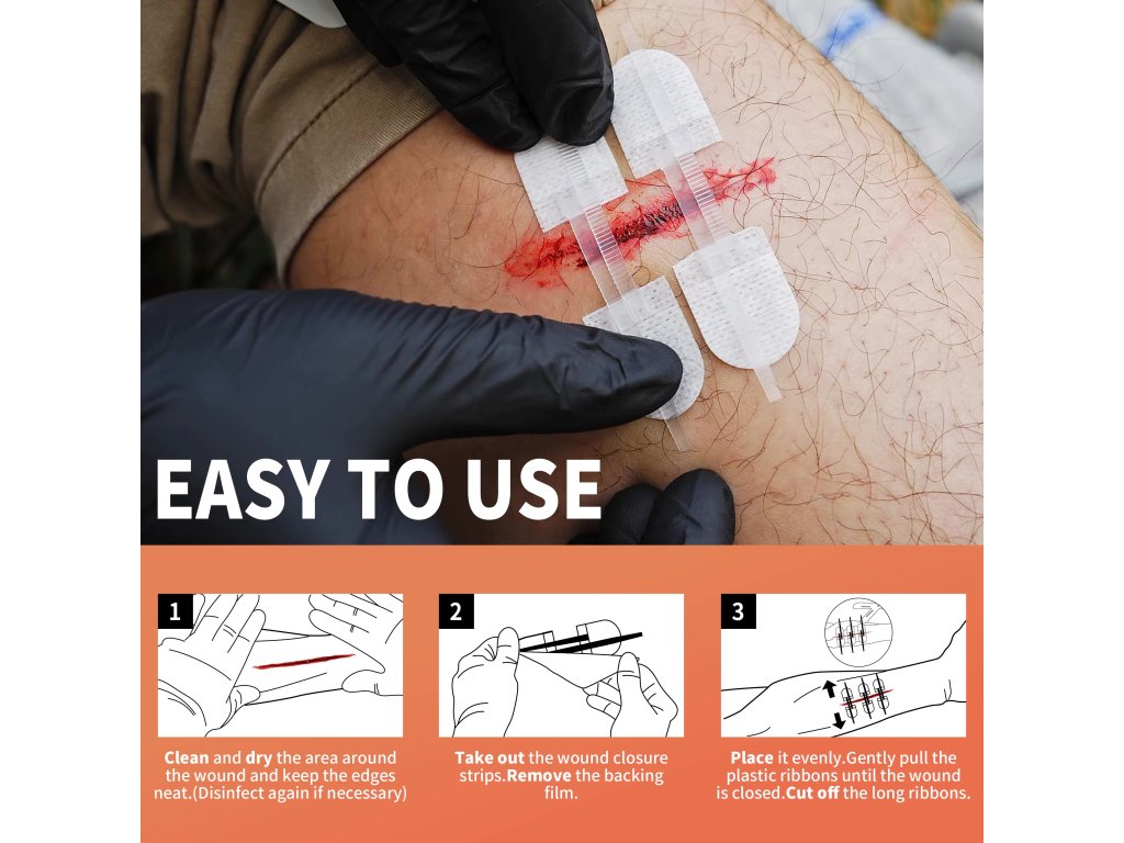 - 3x Zip-Stitch zařízení: Pásky s mikrospojkami pro pevné přiblížení okrajů rány.