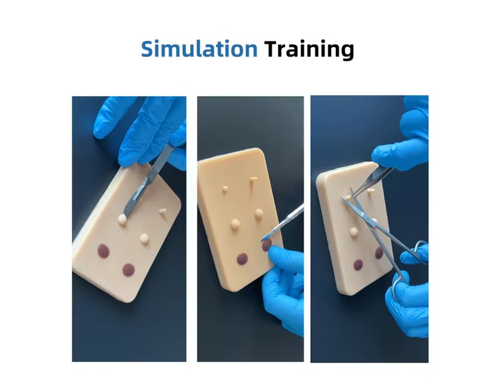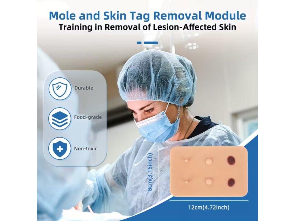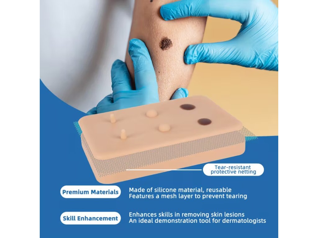 Silikonový modul pro nácvik odstranění kožních útvarů slouží jako realistická tréninková pomůcka pro studenty medicíny, dermatologie a všeobecného lékařství. Umožňuje bezpečný nácvik základních postupů při ošetření a odstranění kožních lézí, znamének či výrůstků.
