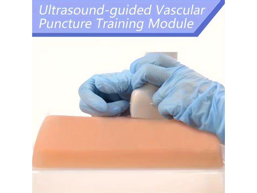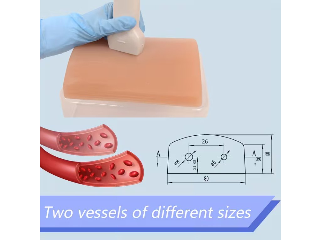 Profesionální vaskulární tréninkový modul určený pro nácvik venepunkce, kanylace a odběru krve. Zahrnuje dvě paralelní simulované cévy (Ø 6 mm a Ø 8 mm) v silikonové tkáni, které poskytují realistickou rezistenci při vpichu.