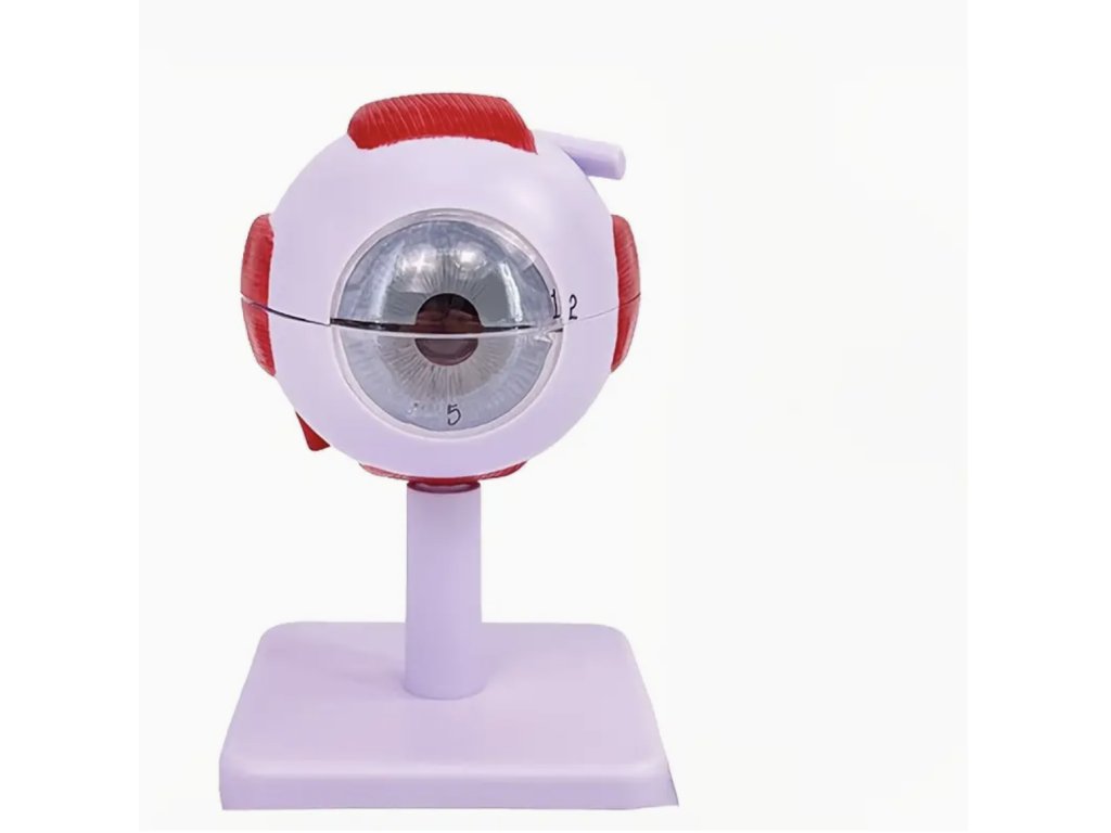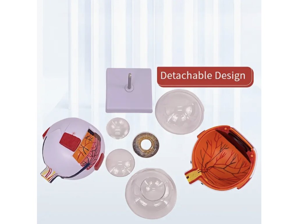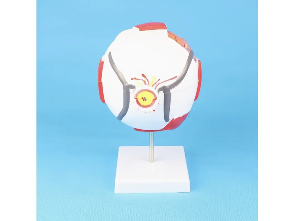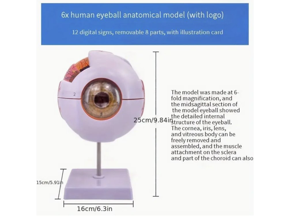 Tento realistický anatomický model lidského oka poskytuje přesný pohled na strukturu oka ve zvětšení 3x a 6x. Vhodný je pro studenty, učitele i zdravotnické pracovníky, kteří chtějí názorně vysvětlit anatomii oka. Model se skládá z několika částí, které umožňují snadnou demonstraci jednotlivých prvků, a zároveň slouží jako originální dekorace do učebny, pracovny nebo ordinace.