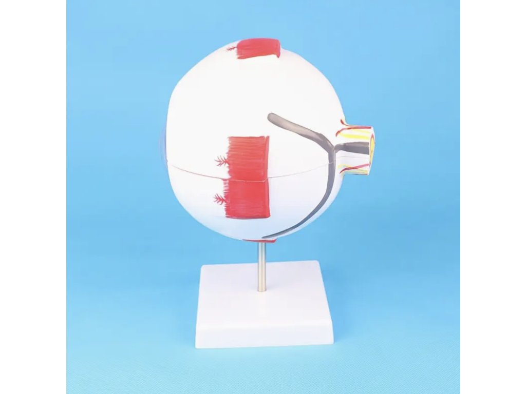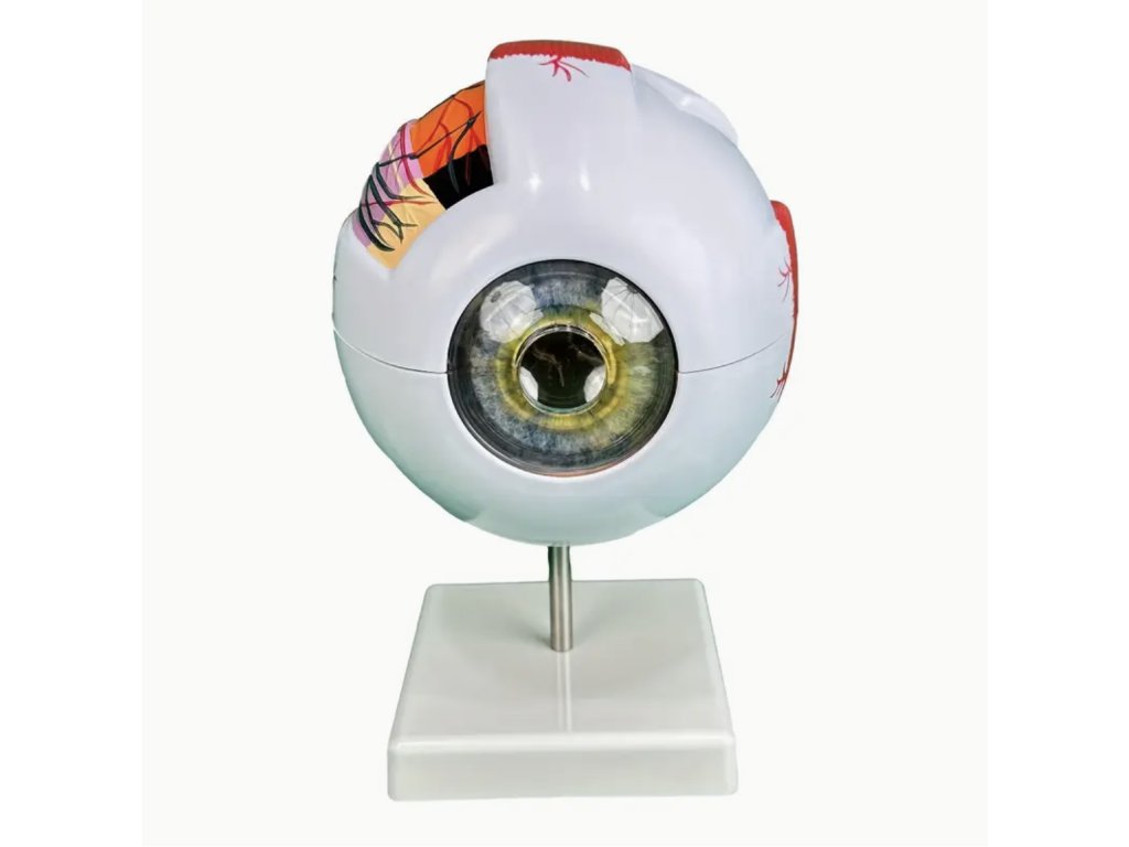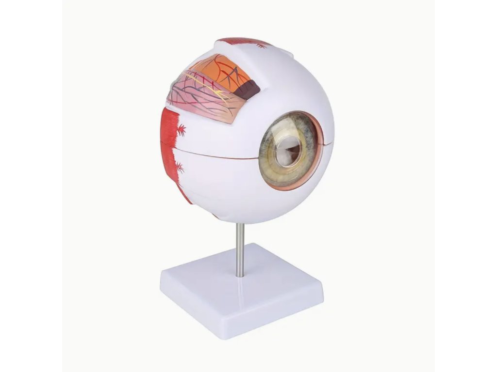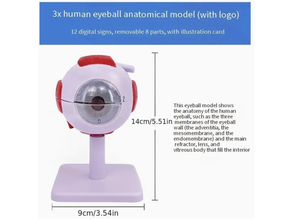 Tento realistický anatomický model lidského oka poskytuje přesný pohled na strukturu oka ve zvětšení 3x a 6x. Vhodný je pro studenty, učitele i zdravotnické pracovníky, kteří chtějí názorně vysvětlit anatomii oka. Model se skládá z několika částí, které umožňují snadnou demonstraci jednotlivých prvků, a zároveň slouží jako originální dekorace do učebny, pracovny nebo ordinace.