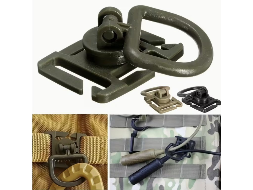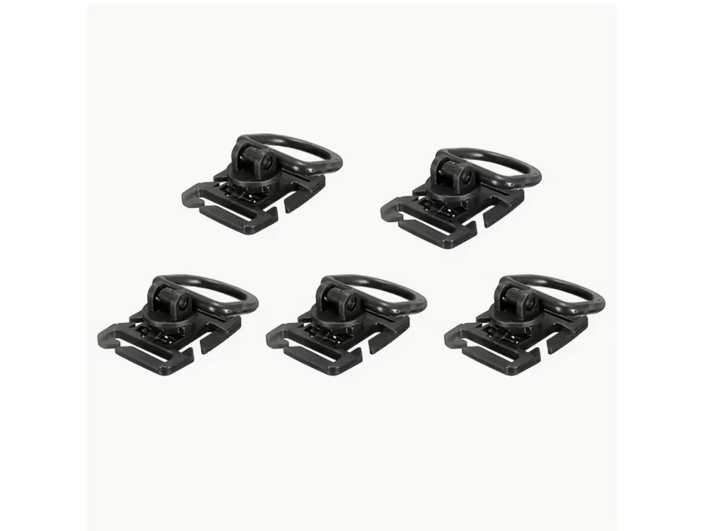 Sada 5 kusů rotačních D-Ring MOLLE spon je ideálním doplňkem pro taktické batohy, vesty a další outdoorové vybavení. Spony umožňují snadné a pevné uchycení vybavení, karabin či příslušenství, a to díky odolné konstrukci z pevného materiálu. Rotace D-kroužku zajišťuje pohodlnější manipulaci a větší flexibilitu při připevnění výstroje. Skvělé pro turistiku, kempování, airsoft, paintball i vojenské využití.