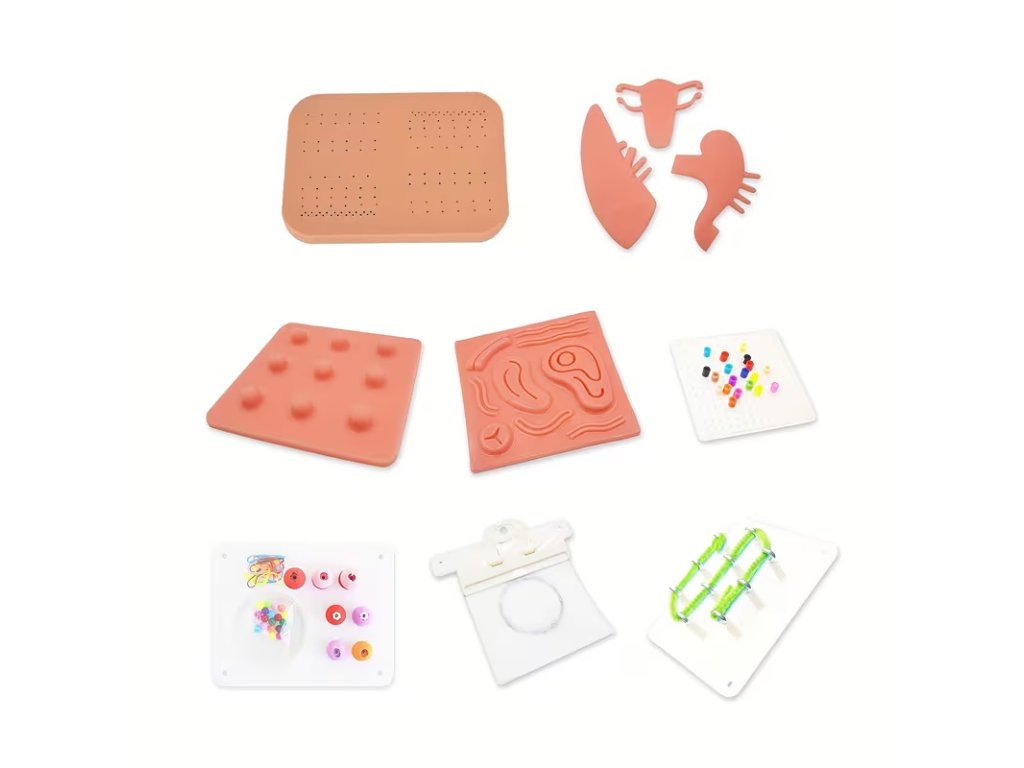 Materiál: lékařský silikon (moduly), ABS/akryl (desky a přípravky), kovové průchodky/čepy.