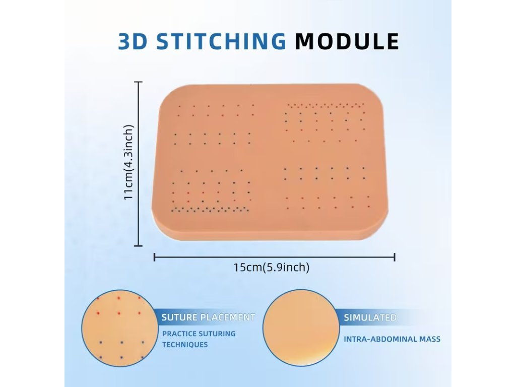 Rozměry vybraných modulů: cca 15 × 11 cm (suturní pad); 15 × 15 cm 3D sutura; ostatní desky podobný formát.