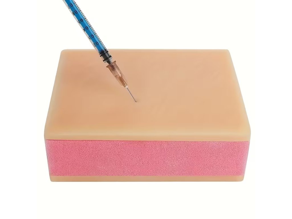 Praktický model „silikonová kůže“ s pěnovým jádrem pro bezpečný nácvik vpichů (např. subkutánně/IM dle metodiky kurzu), manipulace s jehlou, fixace tkáně či práce v rukavicích. Povrch je měkký, poddajný, dobře se štípí prsty; jádro pohlcuje průnik jehly a udržuje tvar. Blok je kompaktní a omyvatelný, vhodný pro studenty SZŠ/VOŠ, kurzy první pomoci i interní školení ve zdravotnictví.